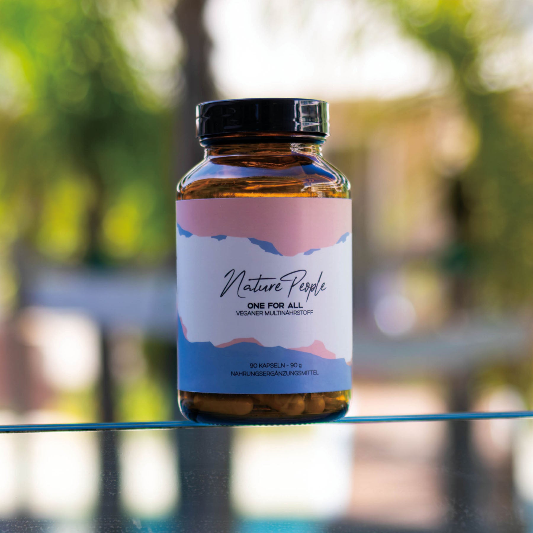 2 Kapseln One for All am Tag decken den kompletten Tagesbedarf der Vitamine B1, B2, B3, B5, B6, B9, B12, Vitamin D, Jod und Selen.